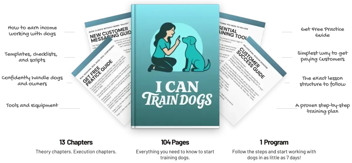 You are getting a copy of I Can Train Dogs ebook, available instantly. You are getting the highly praised Customer Success Guide. You are getting our Essential Equipment List. You are getting our New Customer Message Guide. You’re getting the 7 Days To Becoming A Dog Trainer video series, our Get Free Practice Guide, and access to our FB community.