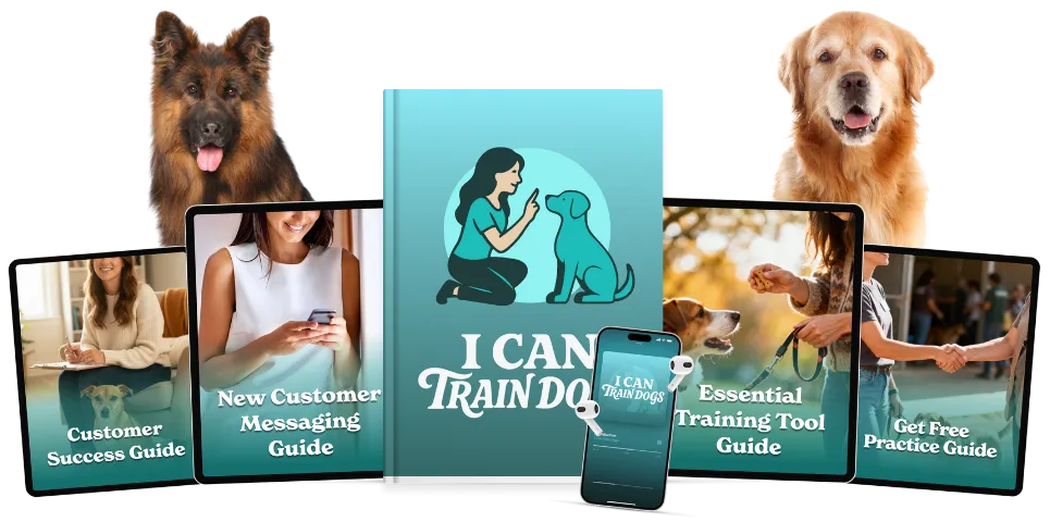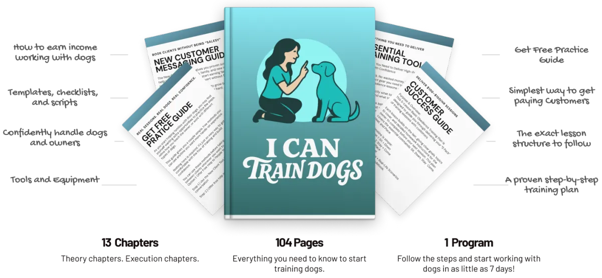 You are getting a copy of I Can Train Dogs ebook, available instantly. You are getting the highly praised Customer Success Guide. You are getting our Essential Equipment List. You are getting our New Customer Message Guide. You’re getting the 7 Days To Becoming A Dog Trainer video series, our Get Free Practice Guide, and access to our FB community.